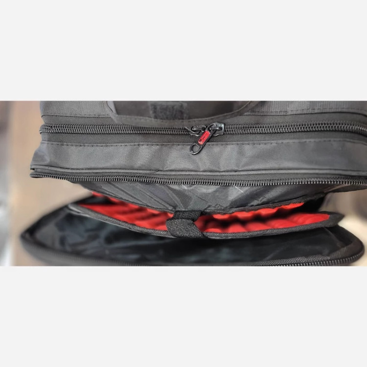 دو زیپ بزرگ در دهنه که یکی به عنوان جای لب تاب و ضربه گیر دار قابل استفاده است